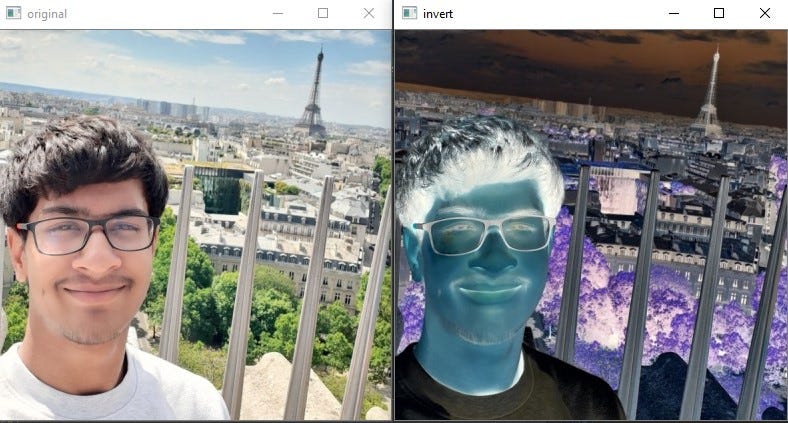 This was the simplest to implement. I am sure all of us have used this filter in one case in our lives and have been scared seeing our faces turn blue and our hair white. All nosotros got to do is to invert the values of pixels i.e. decrease each pixel value past 255. In OpenCV, nosotros use cv2.bitwise_not for this task because inverting the $.25 is subtracting it by 255.