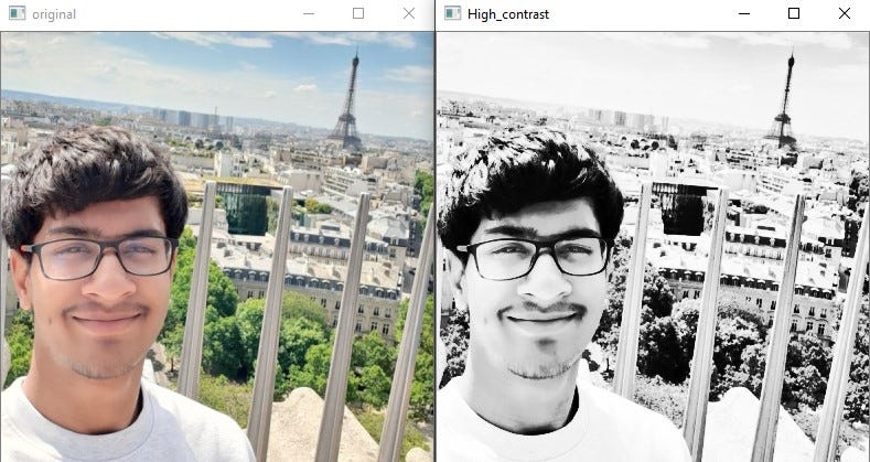The loftier contrast filter in Habitation Photoshop Express is a grayscale filter where the histogram of the image is stretched to the edges. This tin can again be achieved using cv2.LUT and we will create a lookup table using np.interp which is used to obtain piecewise linear interpolation between data points.