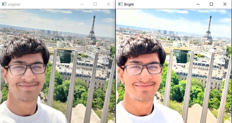 To increase the brightness of our image we can use HSV (Hue, Saturation, and Value) color space also known every bit HSB (Hue, Saturation, and Brightness) which is closer to how humans perceive color. In Opencv their maximum values of Hue range from 0–180 and of Saturation and Brightness from 0–255.
