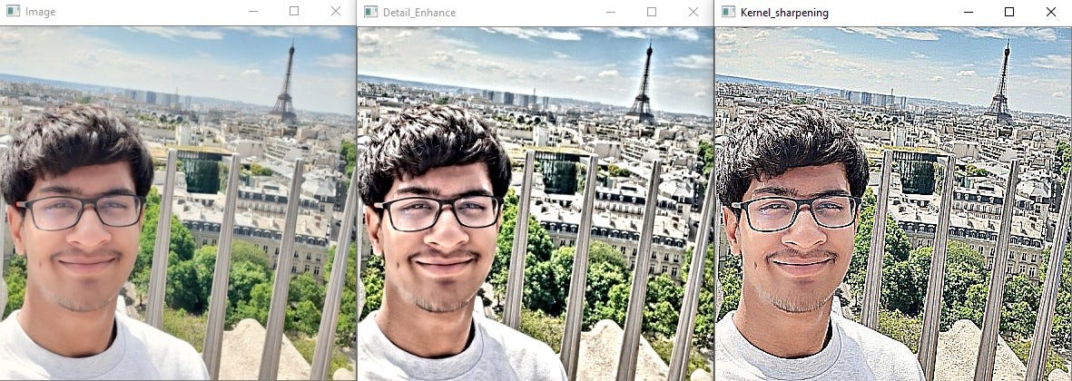 Well, this is sharpening and know I said that this article won't consist of sharpening but the just reason I have included this is to evidence the difference between a predefined role cv2.detailEnhance against the normal sharpening washed in prototype processing using a kernel and to show the brilliant results, we get using it.